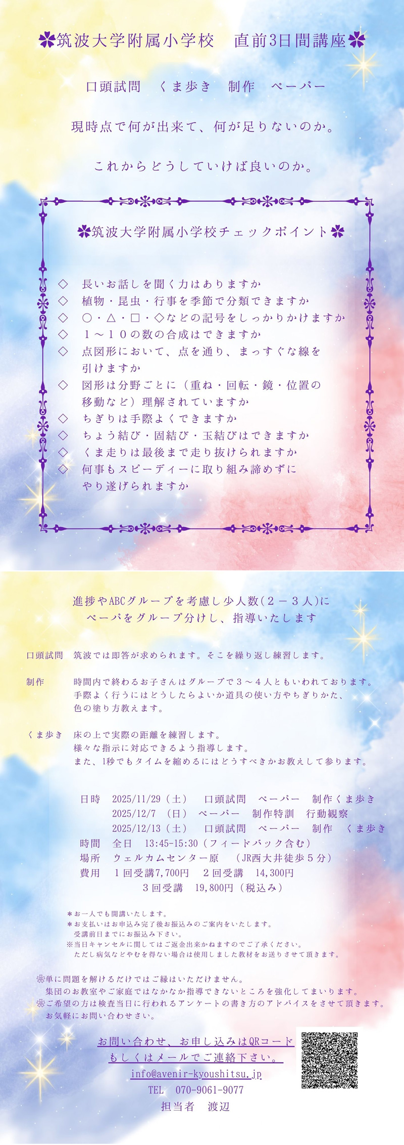 | 日程等: | 2025/11/29(土) 口頭試問・ペーパー・制作・クマ歩き 2025/12/7(日) ペーパー・制作特訓・行動観察 2025/12/13(土) 口頭試問・ペーパー・制作 クマ |